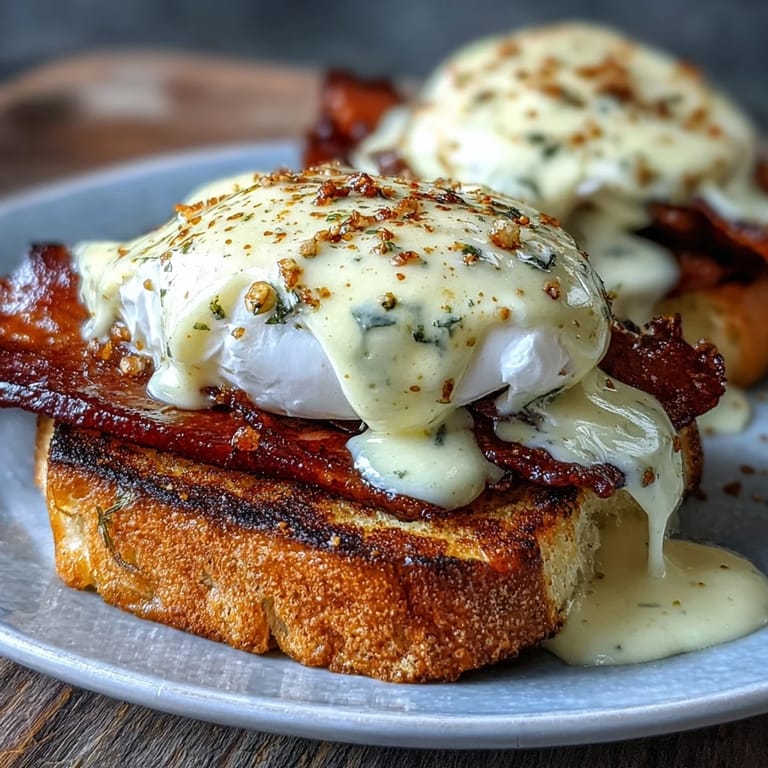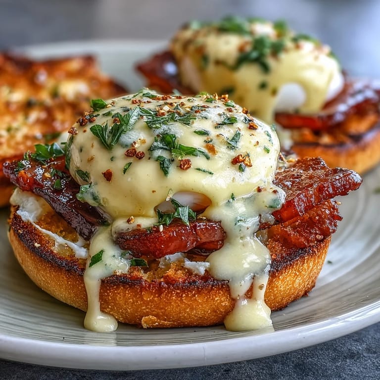 Una vez tuve que improvisar porque faltaba tocino canadiense, así que usé espinacas frescas salteadas y un toque de aguacate para una versión primavera. Resultó una deliciosa sorpresa: la textura de la espinaca y el cremoso aguacate combinaron perfecto con la salsa. Incluso quienes juraban solo amar el original, pidieron repetir. Si te animas, juega con lo que haya en la nevera y verás que la receta tiene mil vidas.