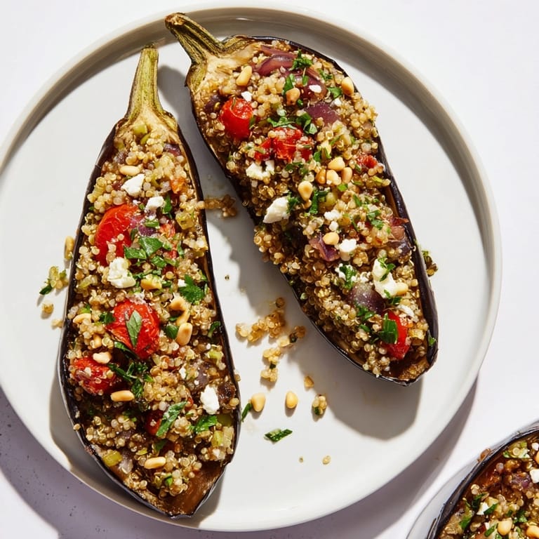 Guardar Esta berenjena al horno rellena de quinoa y pasas es ese plato estrella que hago cuando quiero impresionar a todos sin complicarme demasiado. El dulzor de las pasas el toque especiado y las texturas hacen que hasta el más carnívoro quiera repetir. Perfecto para cenas especiales o para dar un giro original a cualquier comida familiar.
