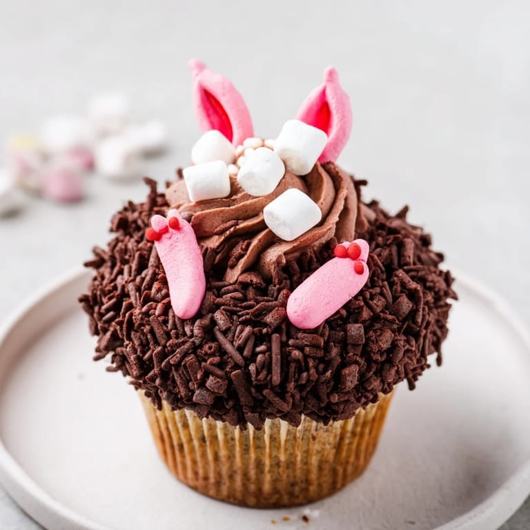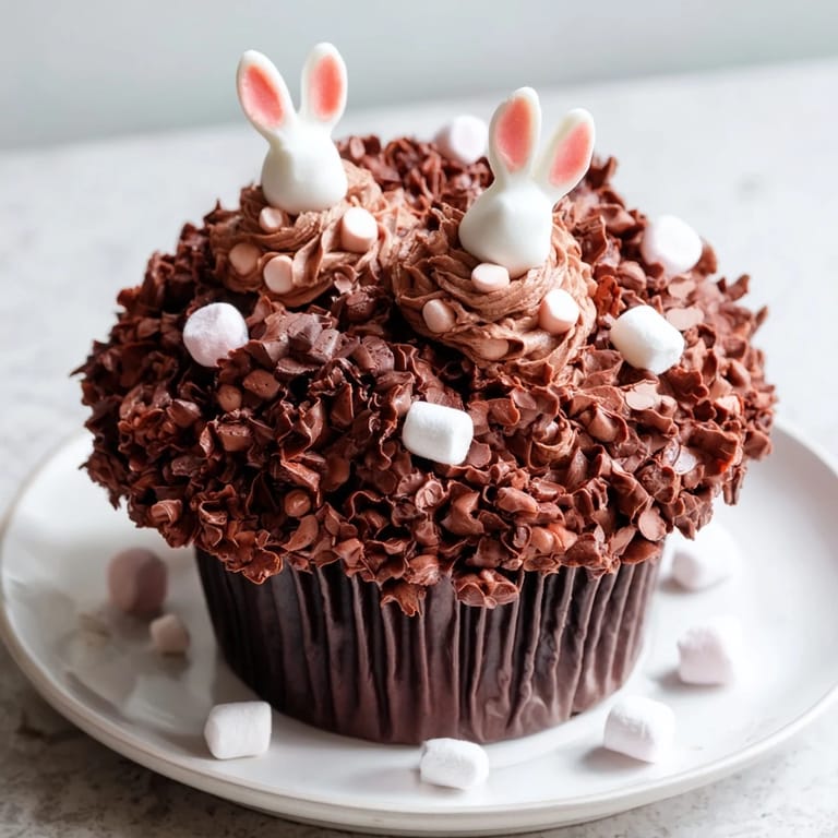 Guardar Adorables cupcakes de chocolate decorados para parecer una madriguera de conejos, perfectos para celebraciones primaverales o reuniones de Pascua. Los cupcakes de chocolate húmedos están cubiertos con delicada crema de mantequilla de chocolate, migas de galleta que simulan tierra y patitas de conejito de fondant asomándose de la madriguera.