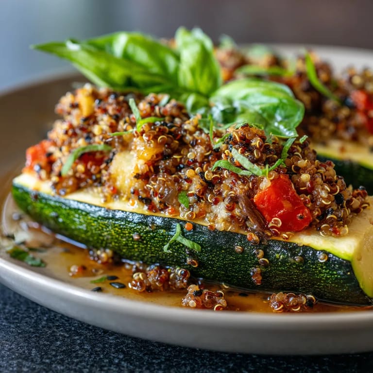 Guardar Estos calabacines rellenos de quinoa y verduras son una forma deliciosa de aprovechar los vegetales frescos y convertirlos en una comida principal nutritiva que siempre alegra la mesa en casa. Me encanta prepararlos cuando quiero algo colorido y lleno de sabor pero que también sea ligero y saludable. La combinación de quinoa con el dulzor de los tomates y el toque de hierbas hace que cada bocado sea reconfortante y sorprendente.