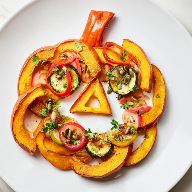 Guardar Un plato festivo y divertido que presenta calabaza asada y verduras coloridas dispuestas para parecer una linterna de calabaza: perfecto para una celebración de Halloween.