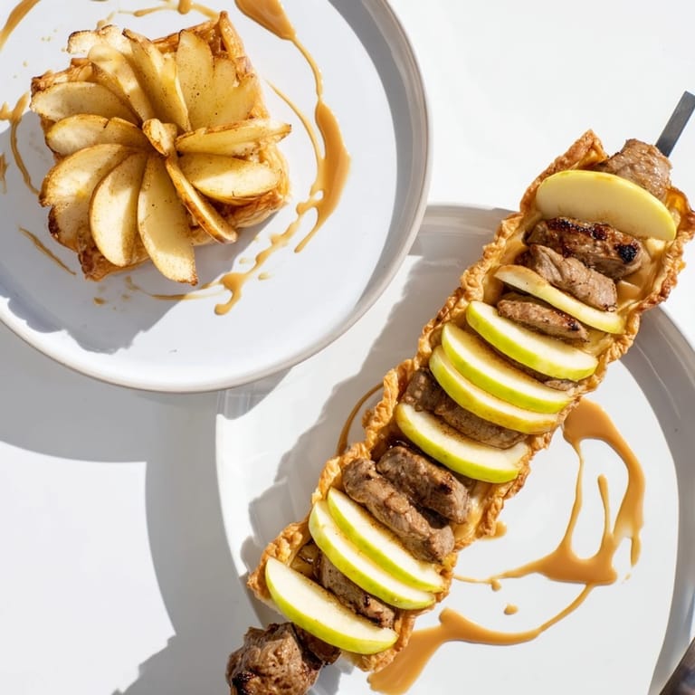 Guardar A playful and delightful combination: buttery caramel apple tartlets served alongside tender herbed lamb skewers. This unique sweet-and-savory treat is perfect for entertaining or as an adventurous appetizer.