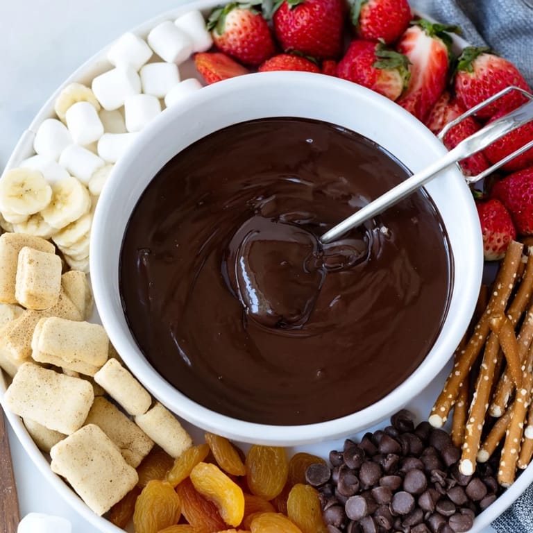 Guardar Una fondue de chocolate caliente servida con una variedad de bocadillos para mojar, perfecta para compartir en reuniones o noches acogedoras en casa.