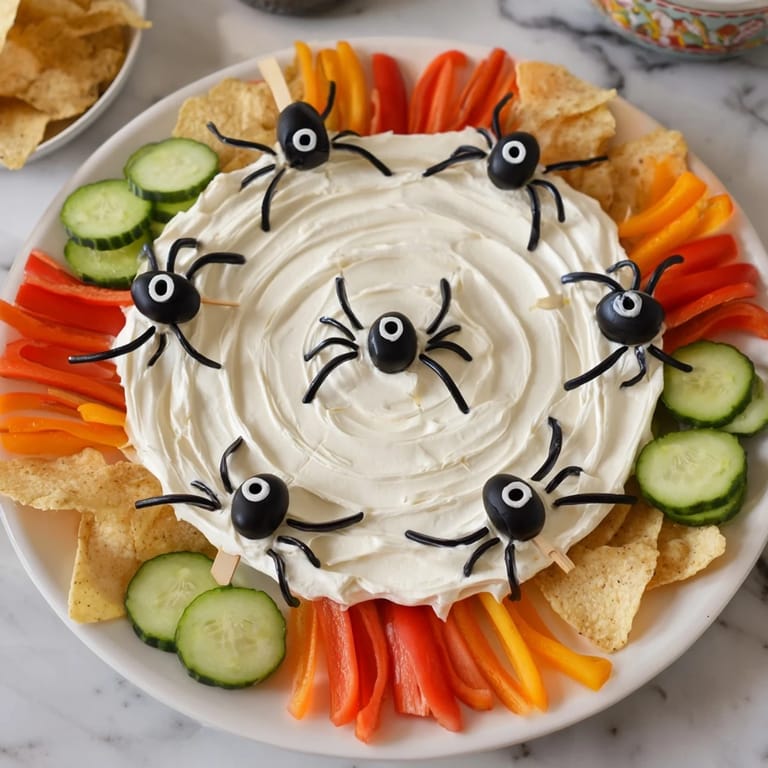 Guardar Una bandeja divertida y espeluznante que presenta un dip cremoso en forma de telaraña, verduras crujientes y arañas comestibles > perfecta para fiestas de Halloween o reuniones temáticas.