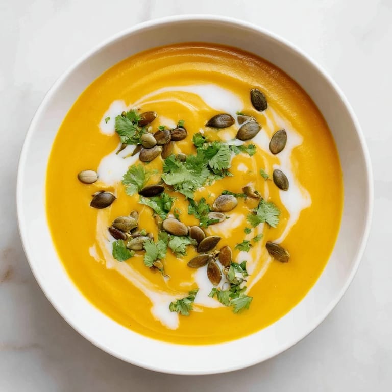 Guardar Una sopa cremosa de calabaza con curry y un toque de coco que brinda un sabor cálido y reconfortante—ideal para las noches frías.