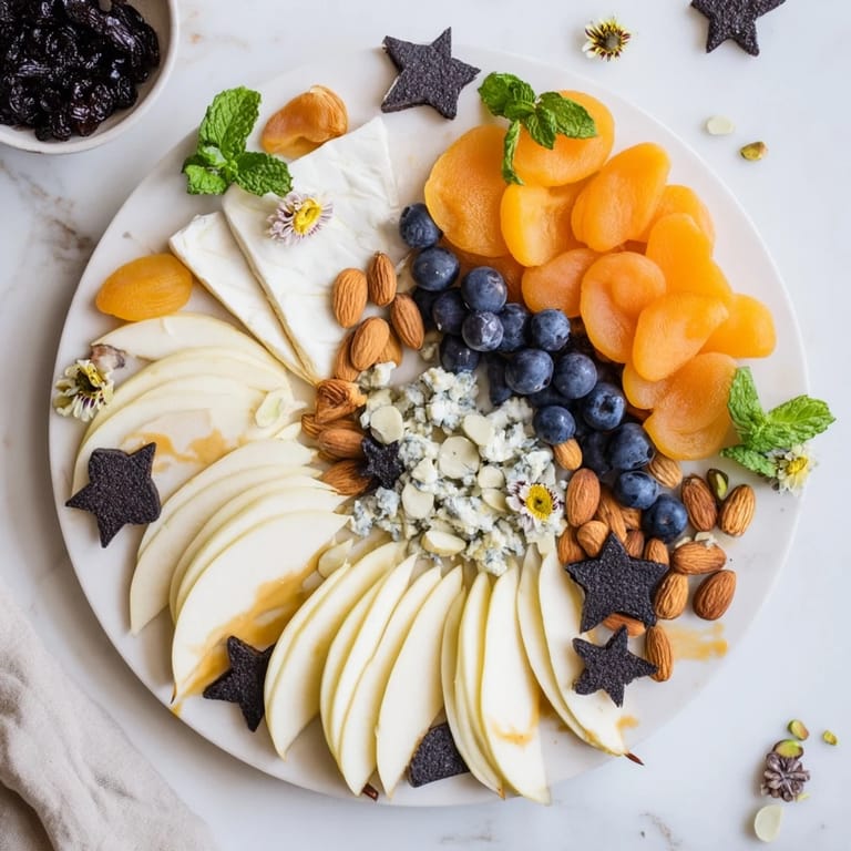 Guardar Tabla de bocadillos luna creciente de medianoche: una tabla de bocadillos temática celestial y caprichosa que presenta una mezcla encantadora de quesos, frutas, nueces y golosinas, perfecta para antojos nocturnos o reuniones especiales bajo las estrellas.