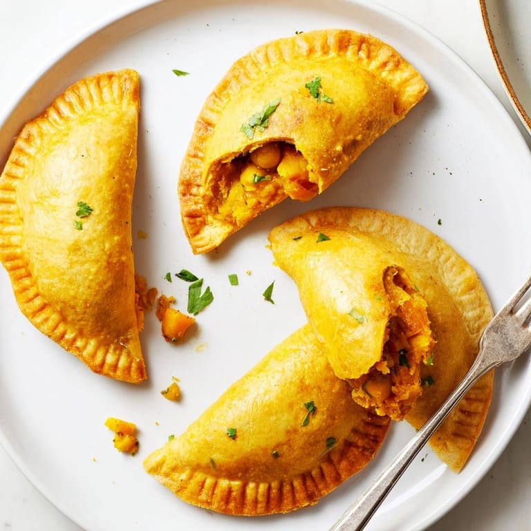 Guardar Estas empanadas de calabaza y garbanzo son ideales para cuando quiero un bocado reconfortante sin complicaciones. Su relleno sabroso y un toque dulce de calabaza asada, envuelto en masa dorada y crujiente, es una mezcla que nunca falla como aperitivo, snack o incluso como comida ligera.