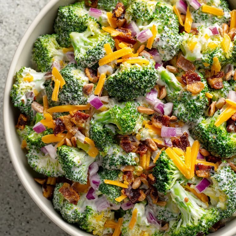 Gran fuente de fibra, vitaminas y antioxidantes, ideal para quienes cuidan su alimentación. Aún más sabrosa al día siguiente gracias al reposo en frío. Se puede preparar con antelación y llevar en táper sin ningún problema. El aderezo es adaptable según tu preferencia de dulzor o acidez. Siempre me sorprende cómo el bacon transforma la ensalada, dándole carácter. Preparo una versión sin bacon para mi tía vegetariana, pero el toque ahumado y crujiente sigue siendo mi favorito en la receta, sobre todo con buenas risas en el patio de casa.