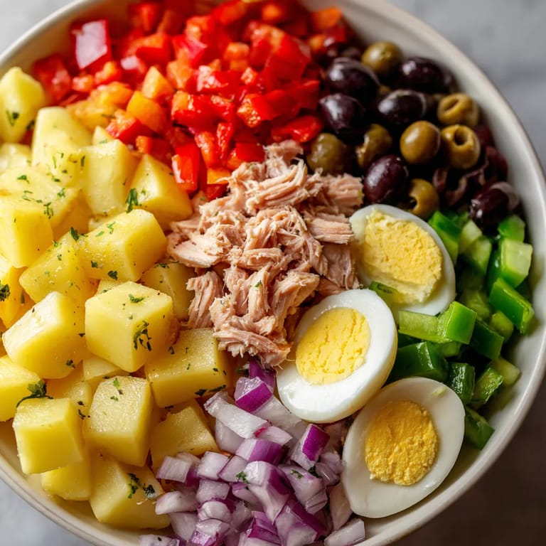 - Coloca las patatas ya cortadas en un bol grande. Añade los pimientos, la cebolla, el tomate, el huevo troceado, el atún bien escurrido y las aceitunas. Mezcla cuidadosamente para evitar romper las patatas.