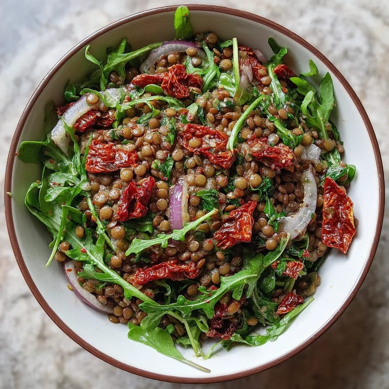 Guardar Esta ensalada de lentejas con tomate seco y rúcula es la respuesta perfecta cuando quiero algo rápido fresco y saludable en cualquier época del año Me encanta llevarla a picnics o disfrutarla como un almuerzo ligero en casa porque combina sabores intensos y texturas que siempre sorprenden