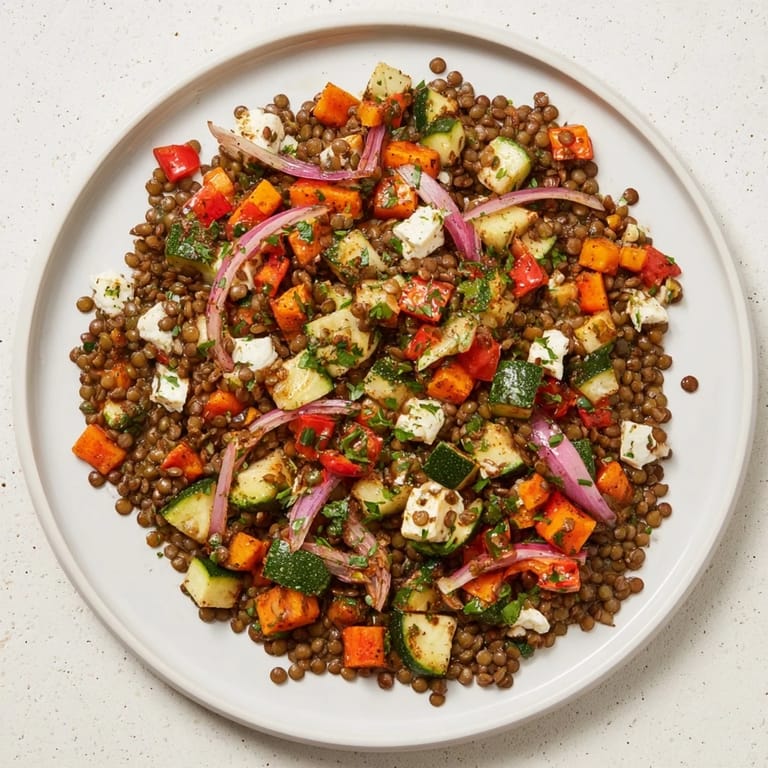 Guardar Esta ensalada tibia de lentejas y verduras combina lentejas tiernas con una variedad de vegetales asados, todo servido con una vinagreta vibrante. Es ideal como plato principal ligero o como acompañamiento colorido en cualquier comida mediterránea.