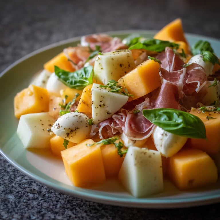 Si tienes sobras guarda la ensalada en un recipiente hermético en el refrigerador durante máximo un día porque el melón suelta jugo y puede alterar la textura del jamón y la mozzarella. No agregues la albahaca ni el aliño antes de guardar así mantienes la frescura.