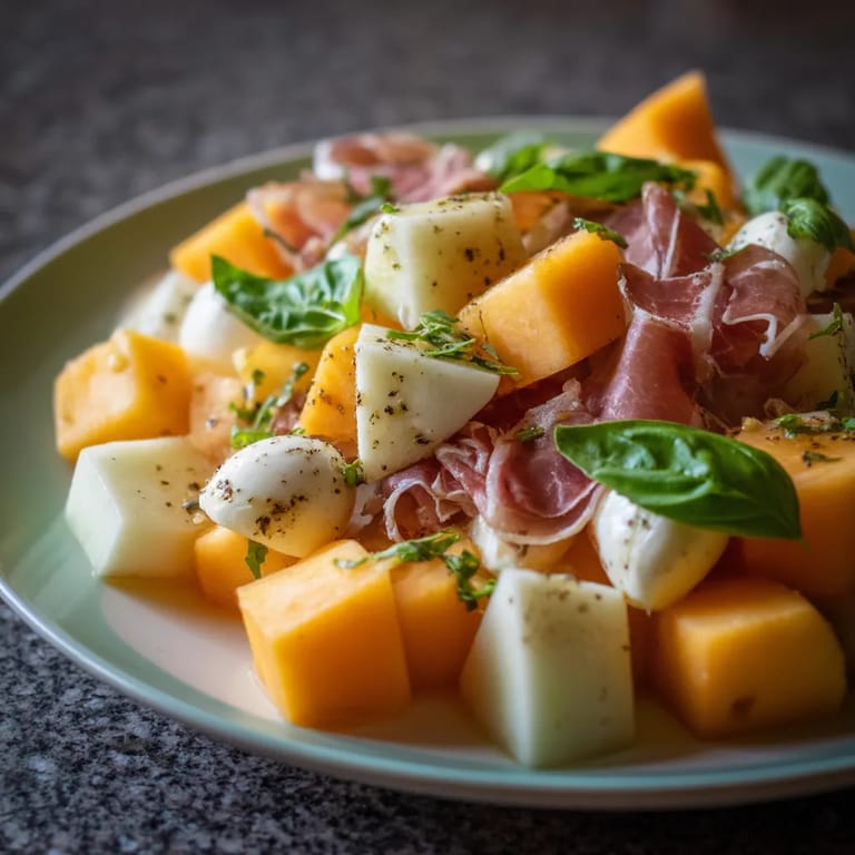 Guardar Esta ensalada de melón con mozzarella y jamón crudo es lo mejor cuando buscas algo fresco rápido y elegante para los días de calor. La combinación dulce del melón con la suavidad de la mozzarella y ese toque salado del jamón lo convierte en un plato que nunca falla en las reuniones familiares o cuando simplemente no quiero encender la estufa.