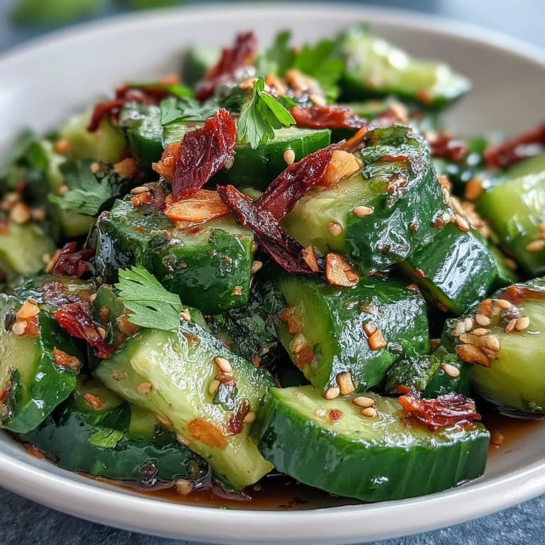Recuerdo preparar esta ensalada una tarde en casa de mi amiga, mientras charlábamos sobre viajes y recetas nuevas. El sonido de los pepinos al ser machacados nos arrancó risas, y el aroma del ajo dorándose hizo que todos se asomaran a preguntar qué estábamos cocinando. Fue el tipo de receta que une a las personas alrededor de la mesa antes de probar siquiera un bocado. Cuando la serví, fue tema de conversación tanto como de disfrute. Salió de la cocina rápida y con ánimo, ideal para momentos animados.