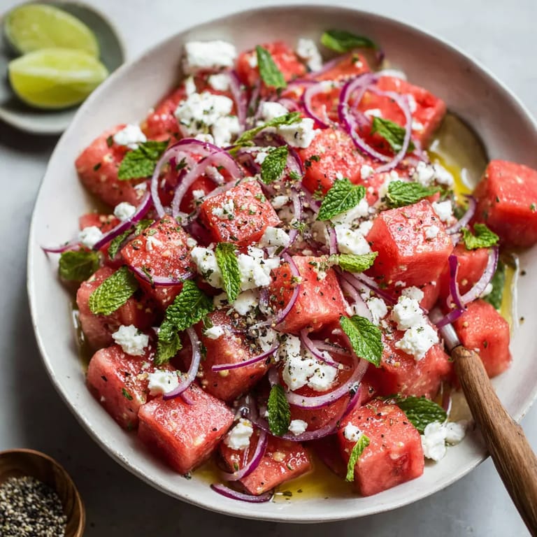 Guardar Esta ensalada refrescante de sandía feta y menta es la opción perfecta para los días calurosos o cuando buscas algo ligero pero lleno de sabor La combinación de sandía dulce queso feta cremoso y menta aromática no solo resulta deliciosa sino también sorprendentemente equilibrada Me encanta servirla en reuniones familiares de verano siempre desaparece en minutos