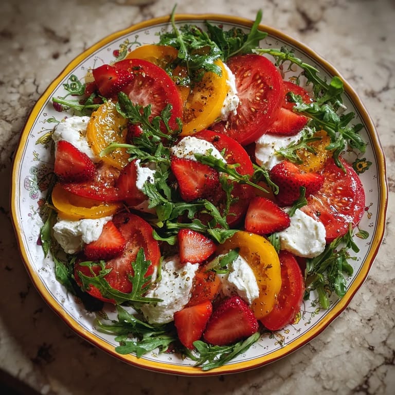 Guardar Esta ensalada fresca y colorida combina la acidez vibrante de los tomates antiguos con el toque dulce de las fresas y la suavidad cremosa de la ricotta Resulta ideal para días soleados o como entrada elegante cuando tienes invitados En casa la preparo cada vez que los mercados ofrecen tomates en su punto y fresas jugosas celebrando así los sabores de la temporada