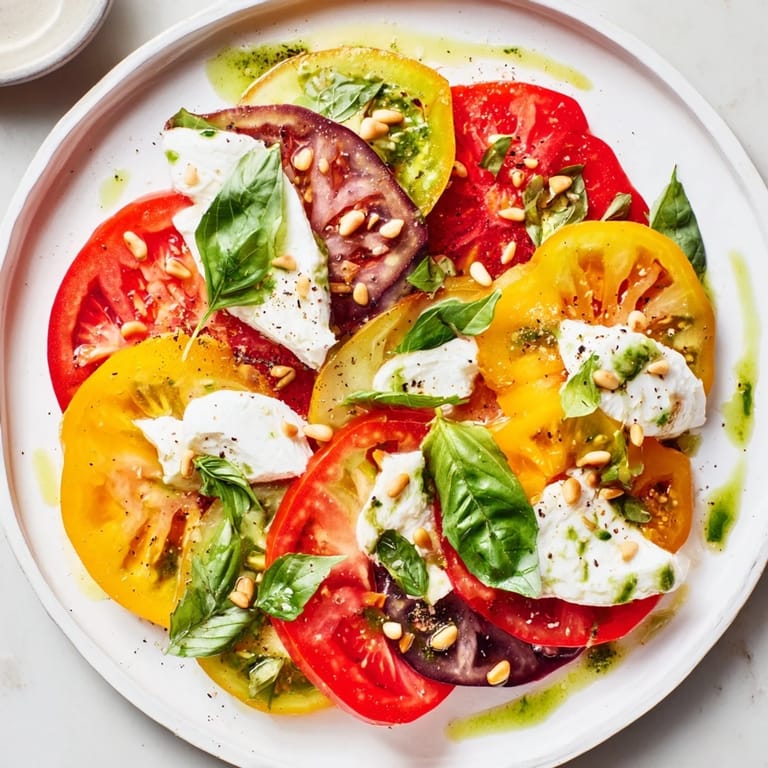 Guardar Descubrí que una tabla de ensalada puede ser más que una comida: es una forma de invitar a alguien a la mesa sin hacer mucho alboroto. Pasado el mediodía de un sábado en julio, cuando el calor hace que cocinar parezca una locura, armé esta tabla con los tomates más hermosos del mercado de agricultores locales. No sabía exactamente cómo combinarlos, así que simplemente dejé que sus colores hablaran, apilando esos rojos profundos junto a los amarillos y rayas naranjas. Cuando mi hermana entró a la cocina y vio la tabla terminada, algo cambió: ya no era solo comida, era una invitación a desacelerar.