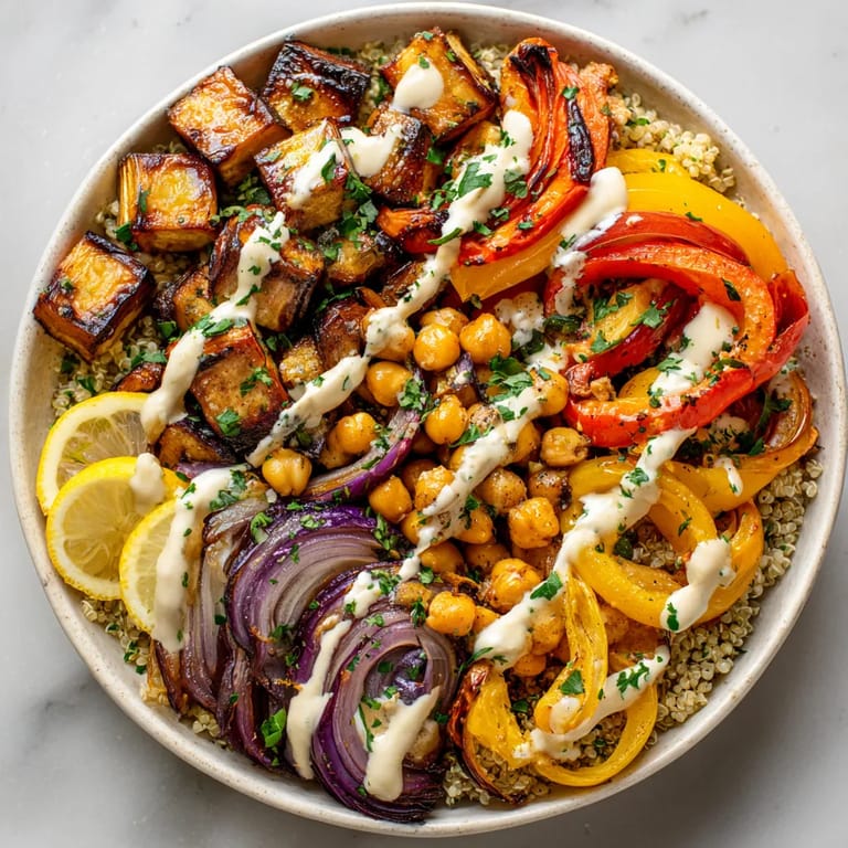 Guardar Este Buddha Bowl de Escalivada es un festival de colores y sabores inspirado en la cocina mediterránea que siempre me devuelve a los almuerzos de verano con mi familia. Los vegetales asados llenan la casa de aromas ahumados mientras la quinoa y los garbanzos convierten el plato en una comida completa y saludable. La salsa de limón con tahini le da el toque fresco y alegre que tanto nos gusta disfrutar cuando queremos algo nutritivo sin complicaciones.