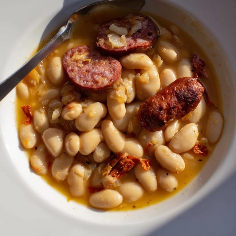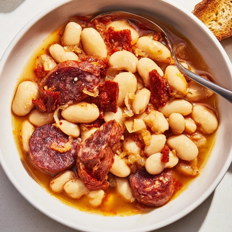 Guardar Un guiso español reconfortante y abundante, con alubias blancas cremosas, embutidos sabrosos y pimentón ahumado. Perfecto para disfrutar en los días fríos o como plato que reúne a la familia.