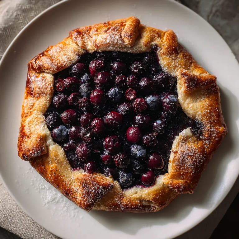Guardar Esta galette de arándanos es mi opción preferida cuando quiero un postre sencillo que celebra los sabores del verano sin complicaciones ni moldes. La masa crujiente se convierte en el complemento perfecto para un relleno jugoso de arándanos frescos, con solo un toque de dulzura y acidez. Me encanta lo fácil que es personalizarla según la fruta de temporada o lo que tenga en la despensa.