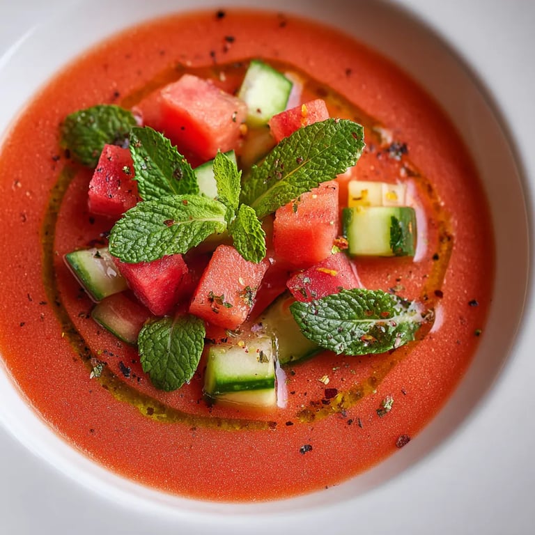 El gazpacho nació como plato humilde de campesinos andaluces transformado con el tiempo en símbolo de la cocina mediterránea La versión con sandía y menta representa la adaptación y versatilidad de la receta al clima y productos de temporada en la región sur de España