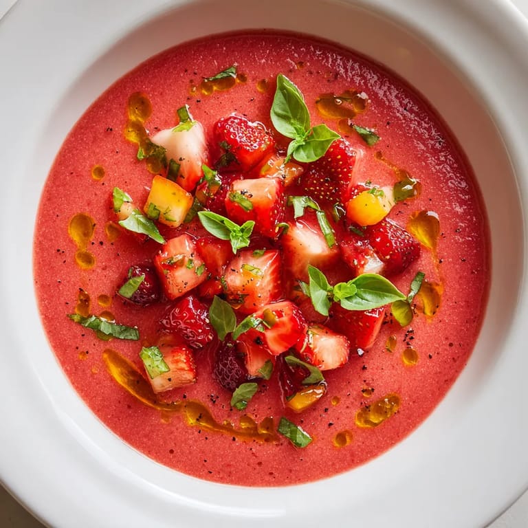 Guardar Este gazpacho de fresas y albahaca es la solución perfecta para días calurosos o cuando solo quieres algo fresco y vibrante. Al mezclar fresas maduras, tomates cherry y hojas de albahaca, logras un plato colorido con un equilibrio único de dulzor y acidez. Si alguna vez pensaste que el gazpacho solo podía ser salado, esta versión te va a enamorar por su ligereza y sabor.