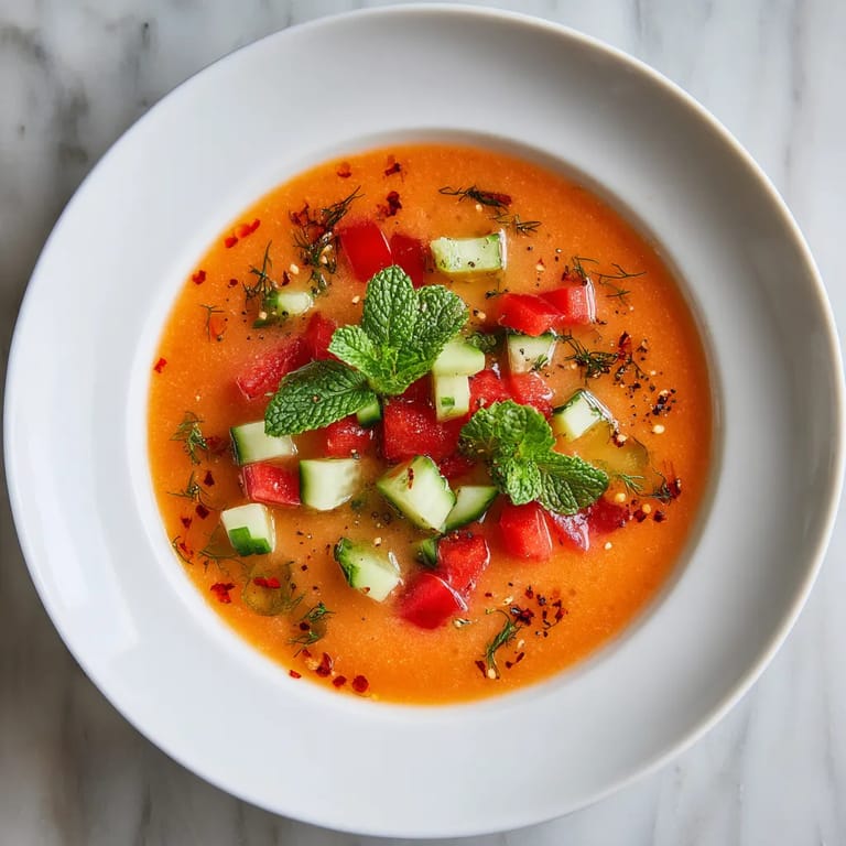 Guardar Este gazpacho refrescante con melón y menta ha sido mi salvación durante los veranos calurosos de España. La combinación de tomates maduros con el dulzor del melón y la frescura de la menta crea una sopa fría que realmente revitaliza.