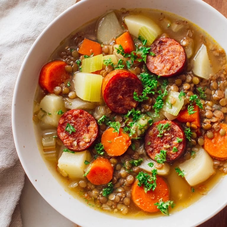 Guardar Un guiso alemán de lentejas en Instant Pot, abundante y reconfortante, que combina las tradicionales lentejas con chorizo ahumado, zanahorias y vegetales de raíz, listos de forma rápida y sencilla.