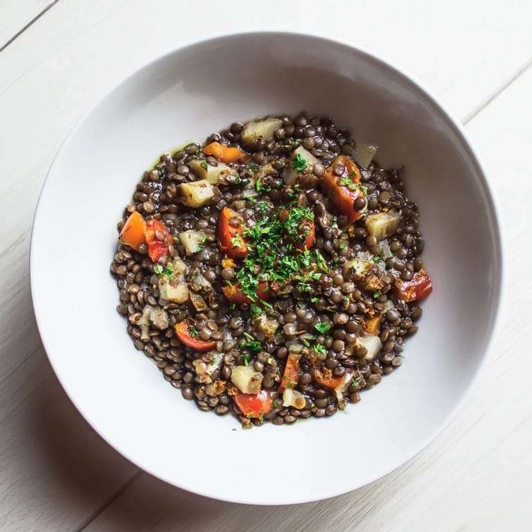 Guiso nutritivo y sabroso con lentejas, ciruelas y especias, ideal para comidas reconfortantes y saludables.