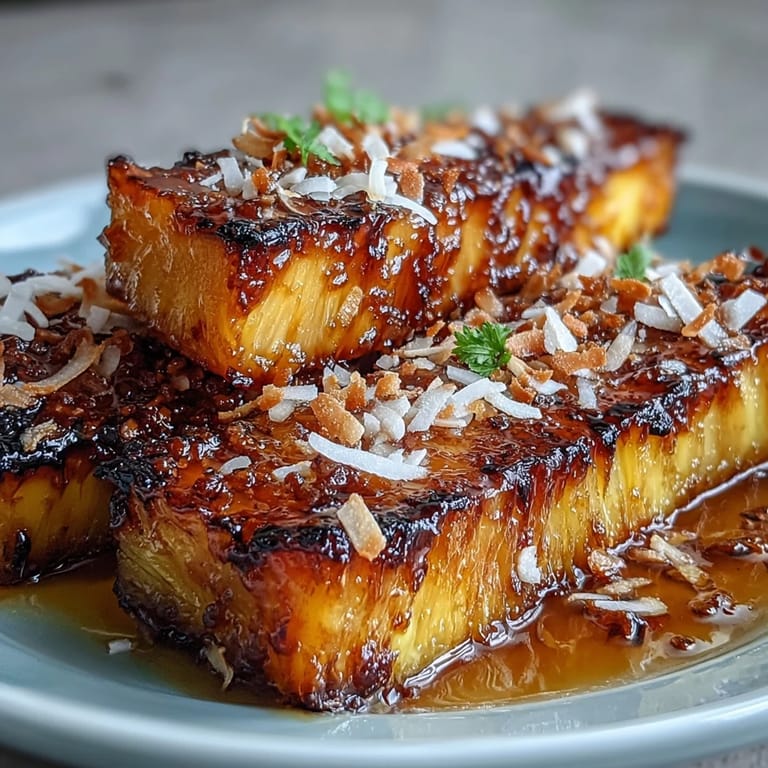 - Coloca la piña asada en un plato, espolvorea generosamente con el coco tostado y sirve mientras aún esté cálida. El calor hace que el coco cruja y el aroma se intensifique.