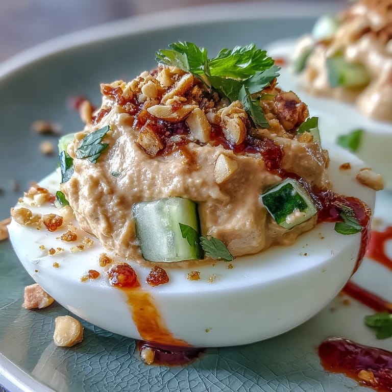 Guardar El zumbido de los huevos burbujeando suavemente en una olla me hace pensar en la energía tranquila de una mañana soleada. Descubrí estos huevos endiablados con toque tailandés después de un antojo inesperado de mezclar sabores clásicos y algo atrevido para una reunión improvisada. Los aromas a cacahuate, jengibre y cilantro llenaron el aire y me arrancaron una sonrisa antes de que hubiera terminado de armar el primer plato. Preparar este aperitivo siempre se siente como darle un giro alegre a lo conocido. Es la fusión perfecta: elegante para invitados, pero irresistible incluso si los comes con las manos en la cocina.