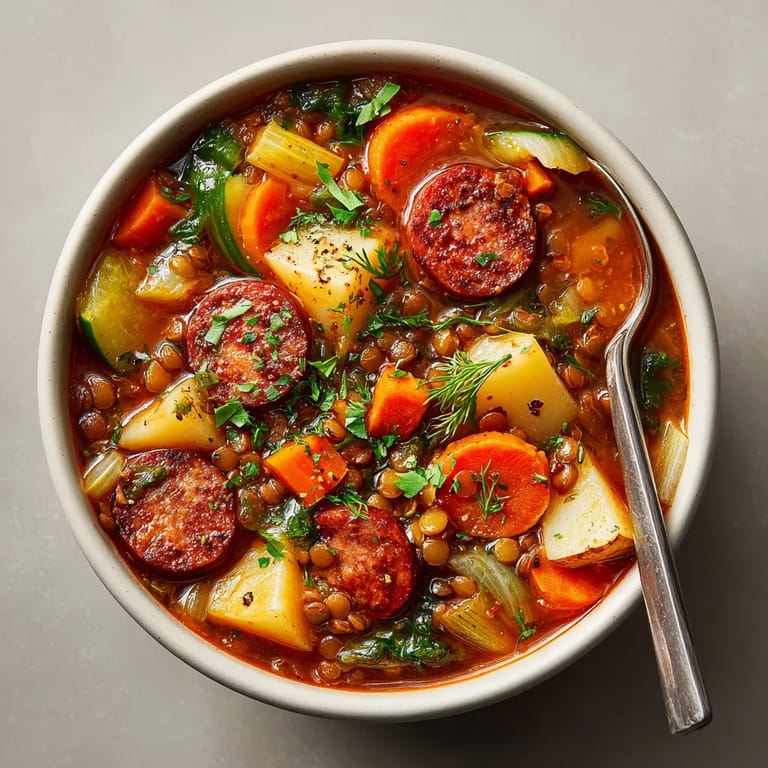 Guardar Este guiso nutritivo de lentejas estofadas con chorizo vegano y verduras de otoño es mi remedio favorito para los días fríos no solo reconforta sino que llena el hogar de aromas cálidos y recuerdos de cocina tradicional pero en versión vegetal Es una receta completa y fácil que siempre tengo lista para compartir en cenas familiares o cuando apetece algo sabroso y saludable