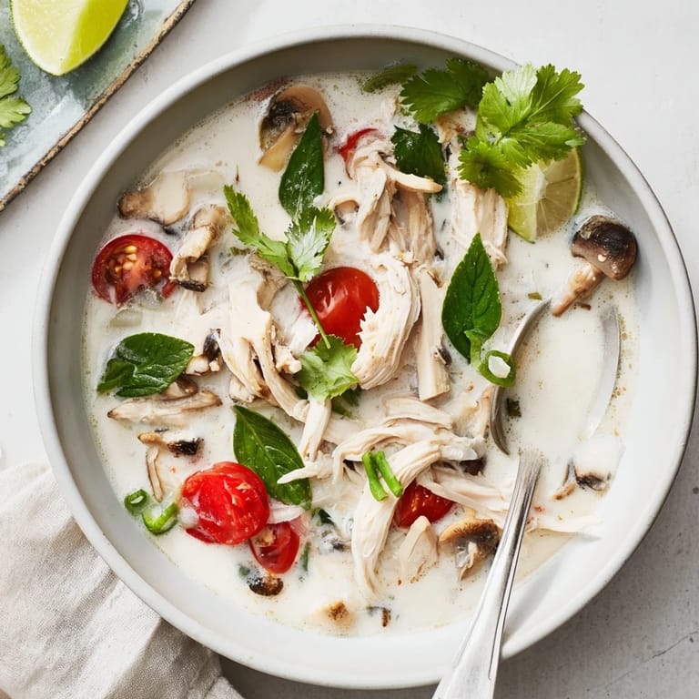He descubierto que esta sopa es increíblemente permisiva con las sustituciones inteligentes. Los camarones en lugar del pollo cocinan en solo dos minutos y añaden un sabor dulce del mar. Para una versión vegetariana, usa tofu firme y caldo de verduras, reemplazando la salsa de pescado con salsa de soja o tamari. Los fideos de arroz añadidos al final la convierten en una comida completa. Incluso he hecho una versión de rápida con jugo de lima y jengibre cuando no encuentro los ingredientes tailandeses específicos, no es idéntico pero still reconfortante.