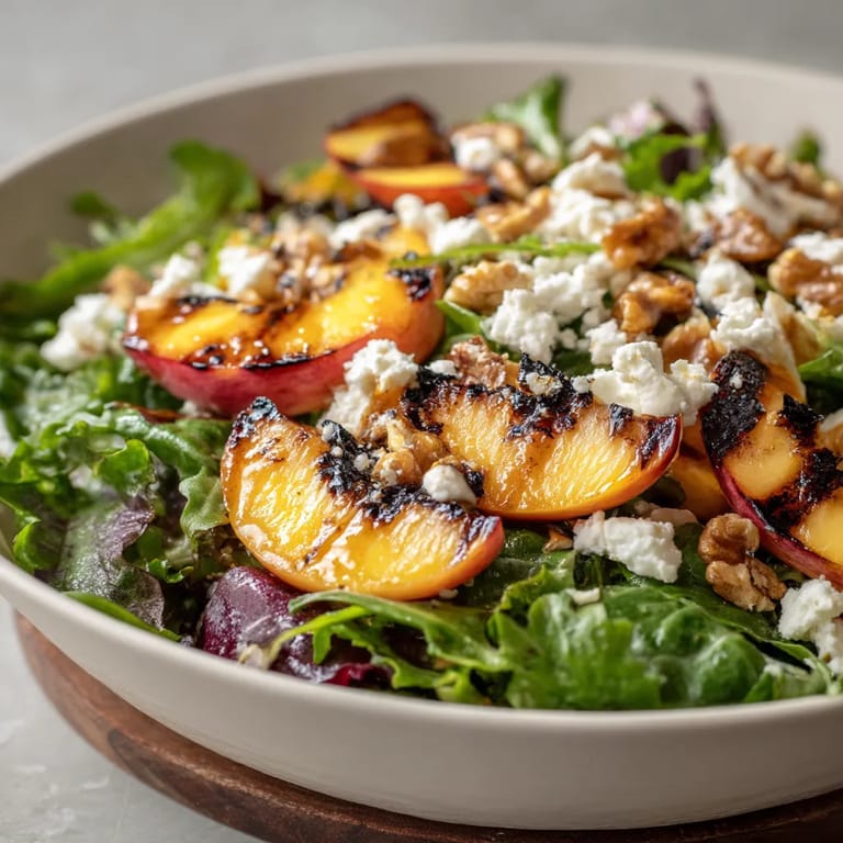 Guardar Esta ensalada me trae recuerdos de los veranos en el Mediterráneo, donde descubrí la magia de combinar frutas asadas con quesos suaves. El melocotón es mi fruta favorita para asar porque su dulzor natural se intensifica con el calor y crea un jugo caramelizado irresistible.