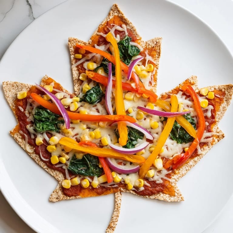 Guardar Mini pizzas en forma de hoja de arce, cubiertas con verduras vibrantes de tonos otoñales y un toque dulce de arce, perfectas para reuniones festivas.