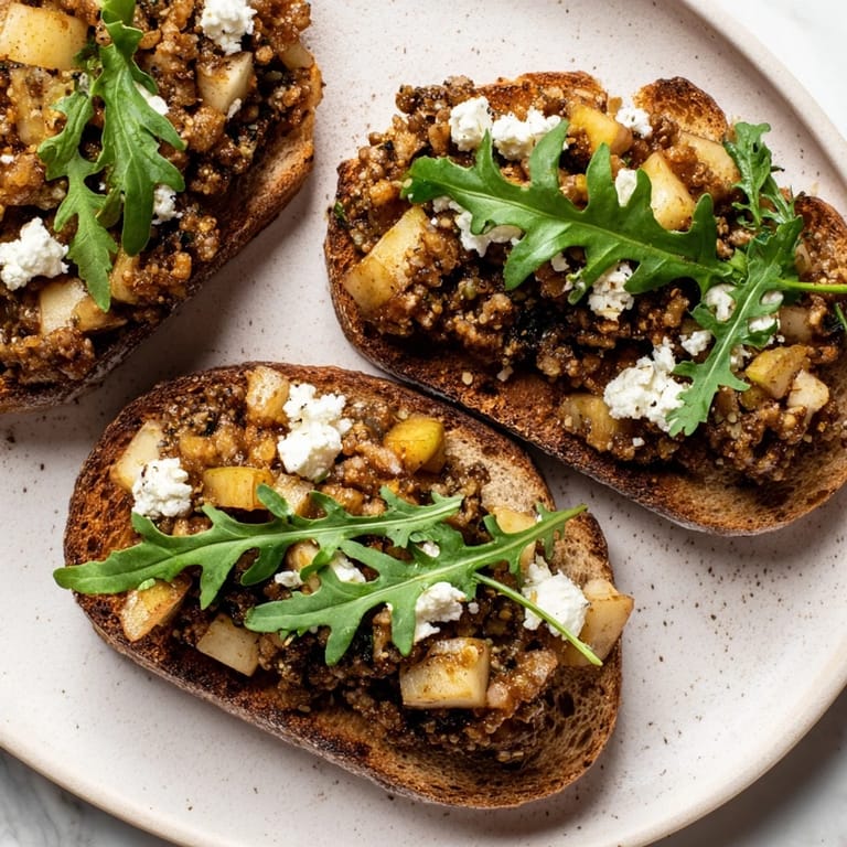 Guardar Una versión moderna de la clásica tartina española de morcilla, que presenta ingredientes más ligeros mientras mantiene sabores audaces y salados. Perfecta como un aperitivo satisfactorio o una comida ligera.