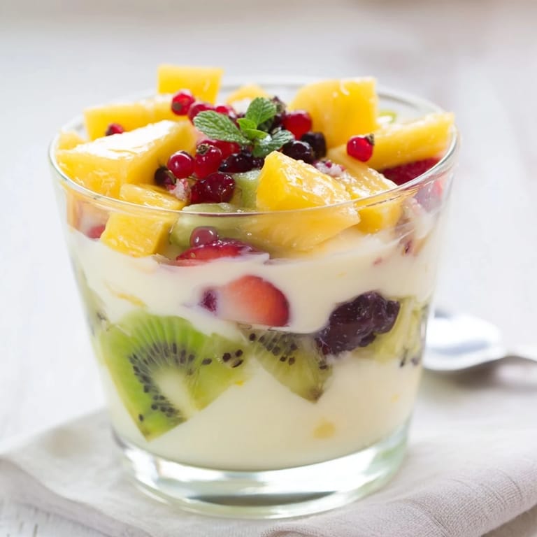Guardar Un postre delicioso y refrescante que combina nata montada esponjosa con frutas frescas y jugosas. Perfecto para un capricho rápido o un final ligero para cualquier comida.