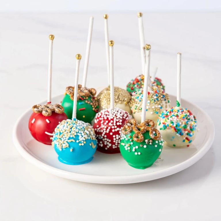 Guardar Una exhibición festiva y llamativa de cake pops decorados como adornos navideños coloridos, perfectos para fiestas y celebraciones.