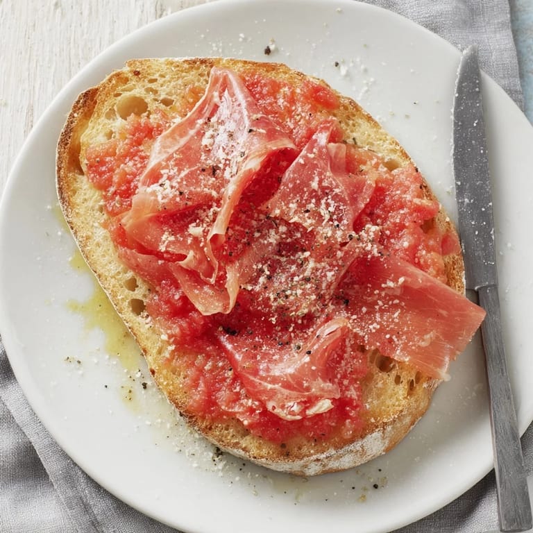 Guardar Pan con Tomate con Jamón Serrano es una tapa clásica española que presenta pan crujiente frotado con tomates maduros, rociado con aceite de oliva y coronado con sedoso jamón serrano: una combinación simple pero irresistible.