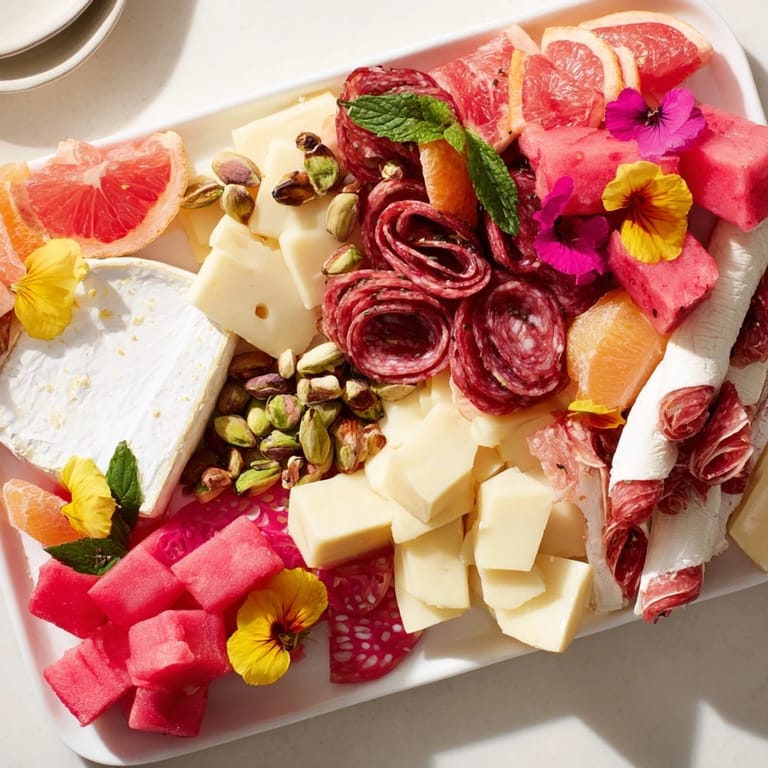 Guardar Una tabla vibrante inspirada en el trópico que presenta una variedad de frutas frescas, quesos, charcutería y toques rosas divertidos — perfecta para fiestas de verano o brunchs.