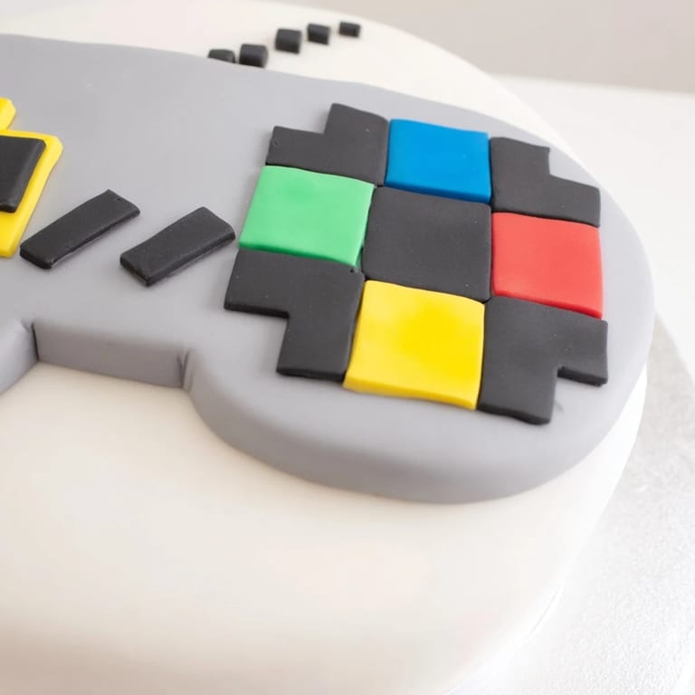- Tint portions of fondant using gel food coloring to create black, gray, and colored buttons. Roll fondant out on a cornstarch-dusted surface. Cover the cake with gray fondant, then decorate with colored fondant pieces to mimic buttons and pixel details.
