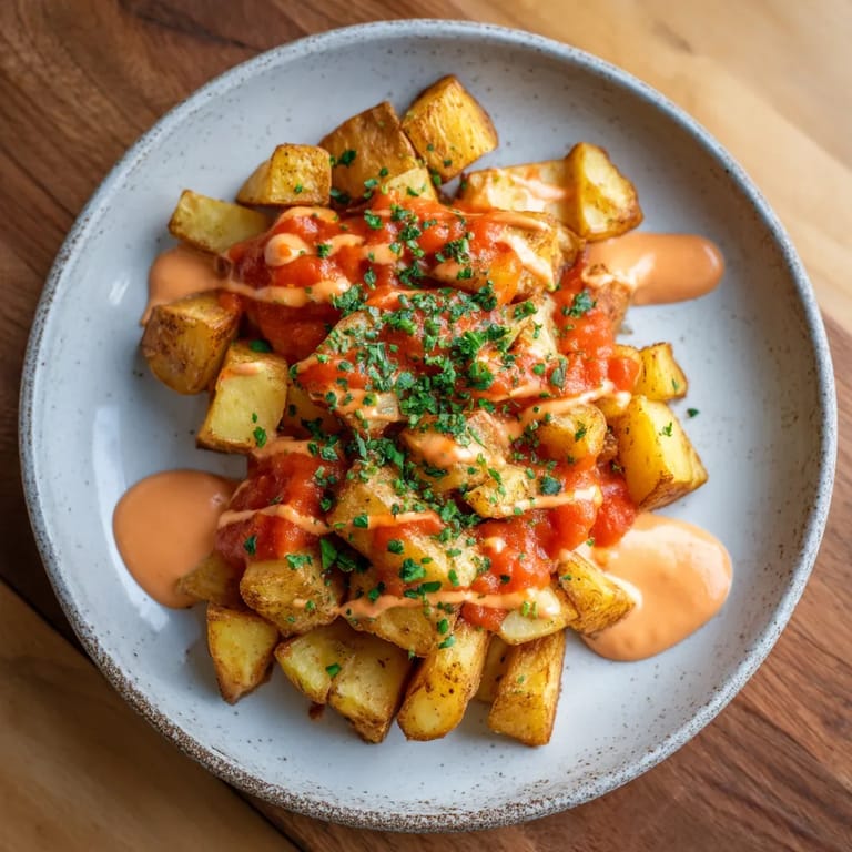 - Coloca las patatas crujientes en un plato de servir. Vierte generosamente la salsa de tomate caliente sobre las patatas. Añade el alioli de pimentón ahumado por encima, creando un bonito contraste de colores. Si lo deseas, puedes espolvorear un poco de perejil picado para dar color y frescura. Sirve inmediatamente mientras las patatas están calientes y crujientes.