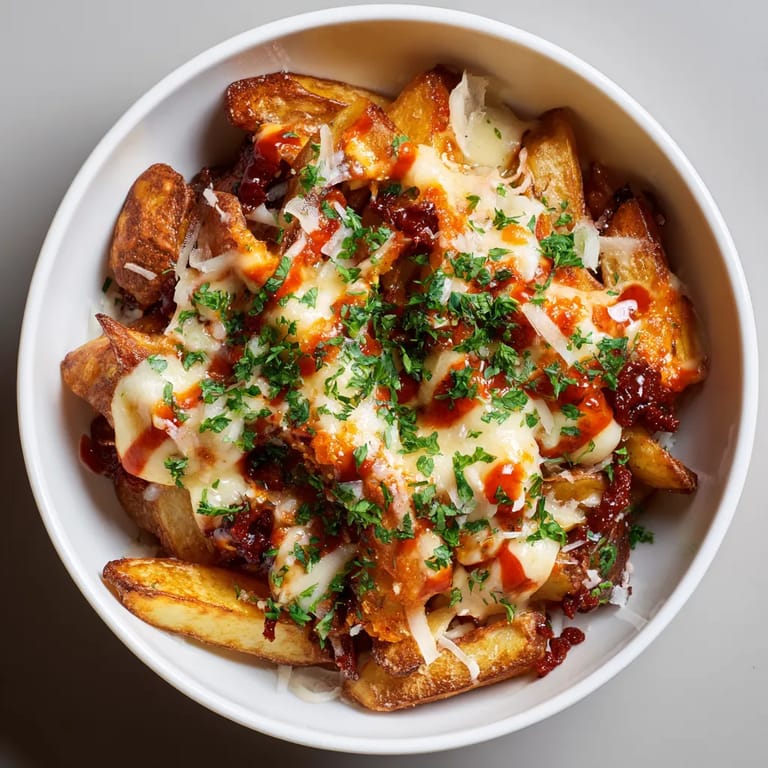Guardar Esta receta de Poutine Ibérica transforma el clásico comfort food canadiense en un espectáculo fusión irresistible que celebra lo mejor de España con el sabor intenso del chorizo y el manchego fundido sobre una base de patatas bravas doradas. El coulis vibrante y la salsa brava ligera la convierten en el picnic perfecto o el plato estrella para sorprender con el tapeo más original.