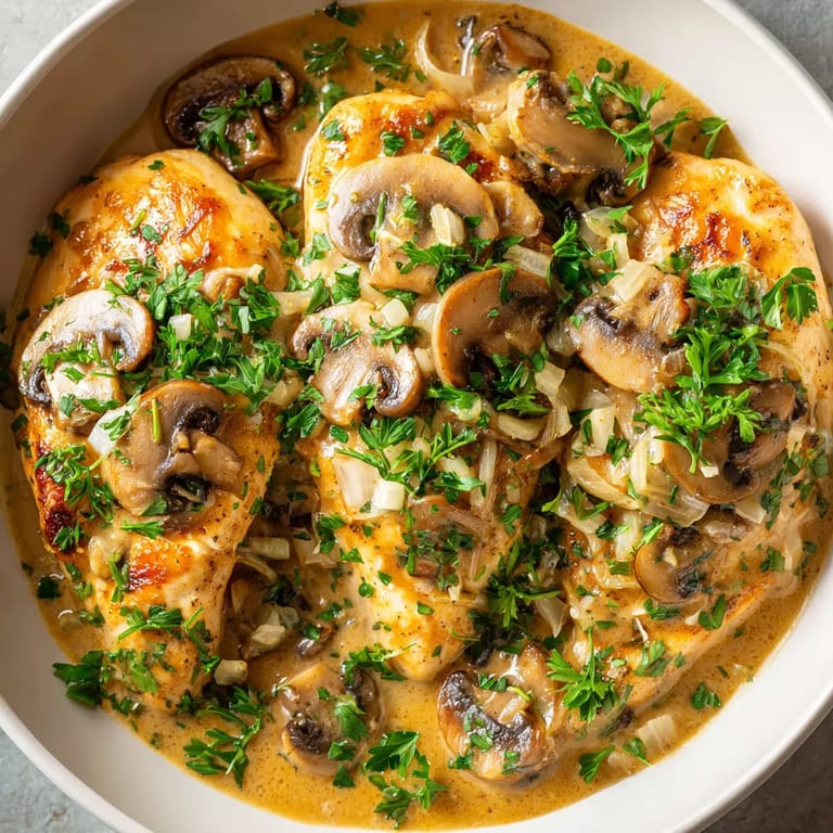 Guardar Esta pechuga de pollo en salsa de champiñones es uno de esos platos que solucionan cualquier comida. Gracias a su cremosa salsa y el sabor profundo de los champiñones, siempre se siente especial, aunque solo tome media hora en la cocina. Es mi comodín para cualquier cena rápida y muchas veces la sirvo cuando vienen amigos sin avisar.