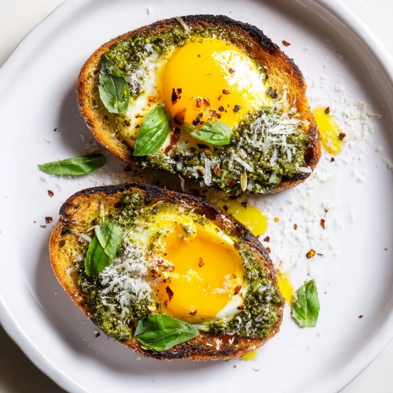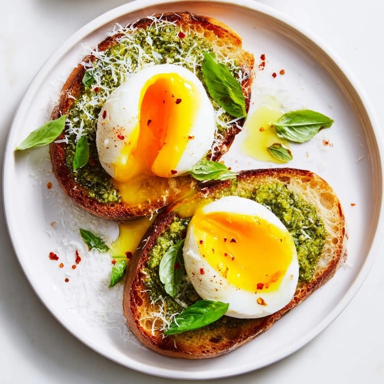 Guardar Una mañana, mientras esperaba que hirviera el agua para el café, noté que tenía huevos frescos y pan de masa fermentada en la despensa. Tomé un frasco de pesto casero que había hecho el fin de semana anterior y, en menos de veinte minutos, creé algo tan simple pero tan satisfactorio que se convirtió en mi desayuno de fin de semana favorito. La combinación de la yema cremosa, el pan tostado crujiente y el aroma herbáceo del pesto fue como descubrir que tres ingredientes comunes podrían transformarse en algo verdaderamente especial. Desde entonces, no puedo pasar una mañana sin pensar en esta tostada.