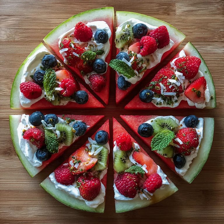 Guardar Esta pizza de sandía es una forma divertida y saludable de disfrutar una merienda o postre en los días calurosos. Satisface el antojo dulce sin sentirte pesado y se prepara en minutos, perfecta para compartir en reuniones familiares o para animar cualquier picnic de verano.