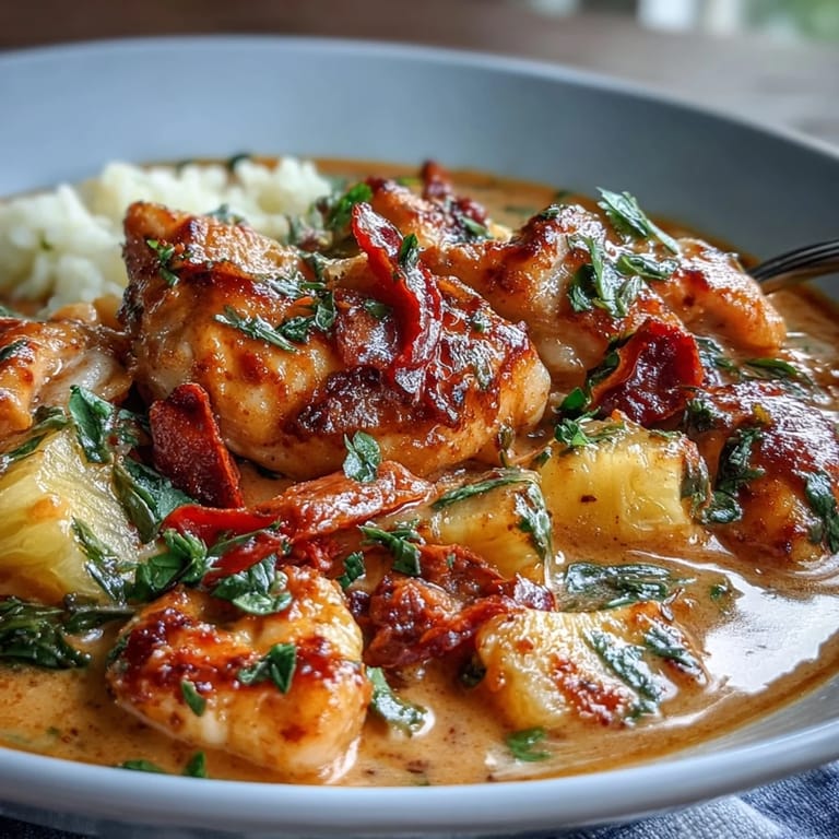 Guardar Descubrí este curry una noche lluviosa cuando mi vecina dejó un recipiente en mi puerta con una nota: «Prueba esto». El aroma que se escapaba era tan cautivador que no pude esperar a que se enfriara. Años después, mientras preparaba mi propia versión en la cocina, me di cuenta de que ese curry no era solo comida, sino una invitación a cocinar sin complicaciones. La combinación de coco cremoso con piña dulce y pollo tierno cambió la forma en que veo los curries de un solo recipiente.