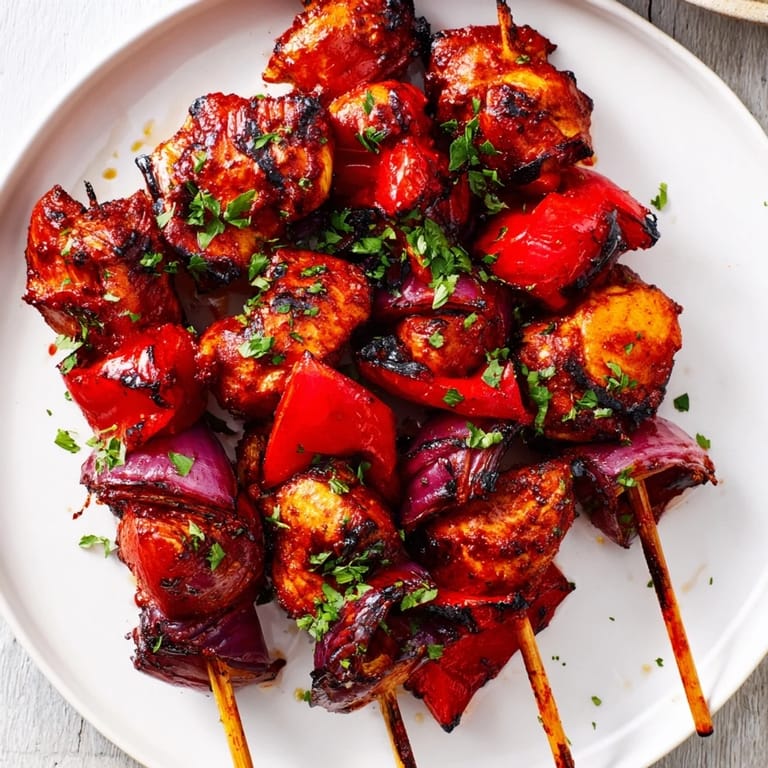 Guardar Brochetas de pollo jugosas marinadas en Glühwein especiado que aportan sabores festivos a un plato principal a la parrilla.