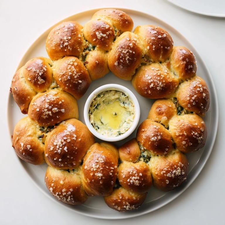 Guardar Un aperitivo festivo y para compartir que presenta bocados suaves de pretzel horneados en forma de corona, perfecto para mojar en una cremosa y quesosa salsa de espinacas en el centro.