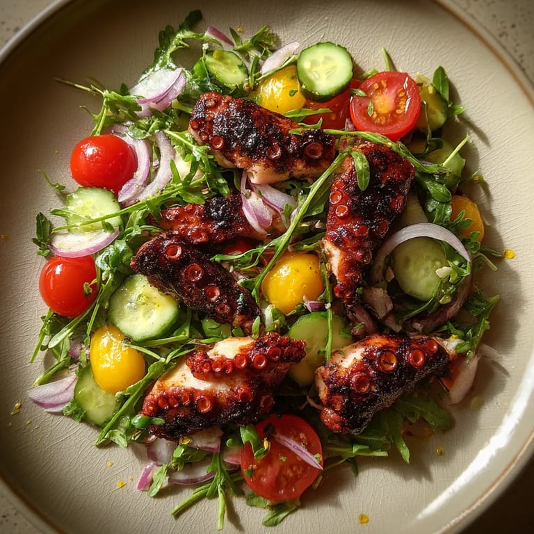Guardar Recuerdo la primera vez que preparé este plato para mi familia. Estaban escépticos sobre el pulpo, pero después del primer bocado quedaron completamente conquistados por su textura tierna y el sabor ahumado contrastado con los ingredientes frescos de la ensalada. Desde entonces, es un plato solicitado frecuentemente en nuestras reuniones.
